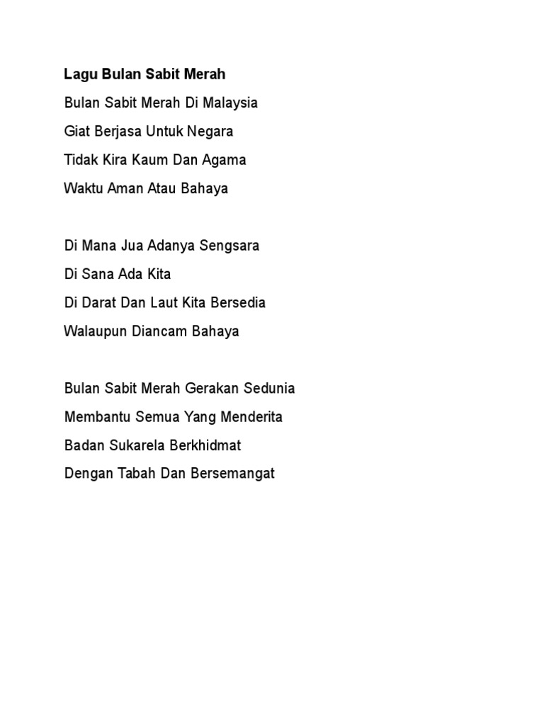 Lirik lagu pbsm bulan sabit merah di malaysia giat berjasa untuk negara tidak kira kaum dan agama waktu aman atau bahaya di mana jua adanya. Saturday May 23 2009 LAGU BULAN SABIT MERAH MALAYSIA Bulan Sabit Merah Di Malaysia Giat Berjasa Untuk Negara Tidak Kira Kaum Dan Agama Waktu Aman Atau. Lagu badan bulan sabit malaysia lirik bulansabit kokurikulum pbsm bbsm.